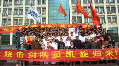 本報(bào)訊(院新聞中心記者孫宏婷、魏依玫)12月8日上午,外國(guó)語(yǔ)言文學(xué)系、藝術(shù)設(shè)計(jì)系、教育系、管理系四系的教師和學(xué)生300余人齊聚院南區(qū)主樓廣場(chǎng),為在第十一屆全國(guó)大學(xué)生擊劍錦標(biāo)賽中取得優(yōu)異成績(jī)的我院擊劍隊(duì)隊(duì)員及教練舉行隆重的歡迎儀式。副院長(zhǎng)陳嘯、學(xué)生處處長(zhǎng)崔國(guó)慶、基礎(chǔ)部主任胡艷萍、副主任許大慶及各系有關(guān)負(fù)責(zé)人出席。