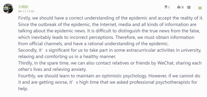對于課程思政,外國語學院的李靜老師有著深刻的理解,“外語課程的思政教育是一個有深度有溫度的潛移默化的教育過程,應該結合課程特點和學生的認知特點,貫徹課程思政隱性滲透原則”。最近幾周,李老師發覺疫情讓不少學生產生了焦慮和煩躁心理,致使學習自律性下降。為緩解學生的焦躁情緒,讓更多學生在線上課堂“多抬頭”“多開口”,李老師在《高級英語》課的線上教學中組織了一次課堂討論:介紹一位你最敬佩的科學家。在討論中,大部分同學都提到了鐘南山和屠呦呦,李老師不僅擴充原有話題的內容與形式,還幫助同學了解防疫、抗疫的相關知識與政策。“這次討論活動不僅幫助學生尋找疫情中的正能量,培養科學觀和求真意識,還能激發學生樹立遠大理想,緩解焦躁情緒。”李老師說道。