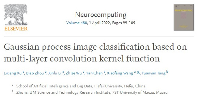 2022年2月,我校人工智能與大數(shù)據(jù)學(xué)院視覺計算課題組2020級碩士研究生周彪同學(xué)(校內(nèi)導(dǎo)師:王曉峰、徐立祥)的研究成果《Gaussian process image classification based on multi-layer convolution kernel function》被國際期刊《Neurocomputing》在線出版。