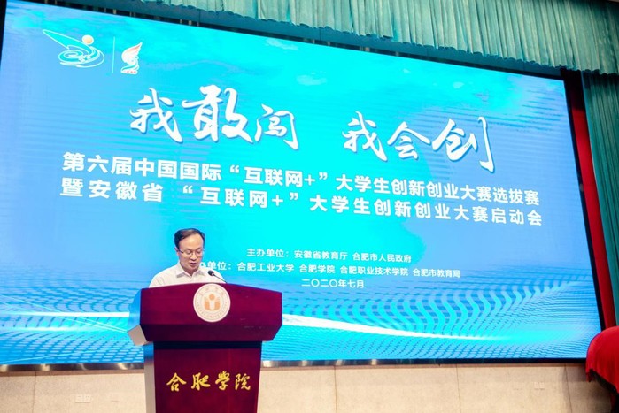 本屆大賽以“我敢闖,我會創”為主題,由安徽省教育廳與合肥市人民政府聯合主辦,合肥工業大學、合肥學院、合肥職業技術學院、合肥市教育局共同承辦。省教育廳副廳長儲常連、合肥市人民政府副秘書長吳昌文、合肥學院黨委書記王其東、合肥工業大學黨委副書記陳剛、合肥職業技術學院黨委書記羅兆好、合肥市教育局二級調研員唐文水出席啟動會,會議由我校校長吳春梅主持。