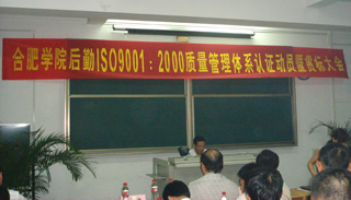 7月24日上午,合肥學院后勤ISO9001:2000質量管理體系認證動員暨貫標大會在北區3號多媒體教室隆重舉行。副院長鄭永紅副教授,管理系主任李道芳副教授,總務處處長何世昆、副處長王福青,后勤集團副總經理董功臣、李多社及總務、后勤全體工作人員近200人出席會議。北京“經典智業認證咨詢中心”咨詢專家魏廣飛應邀參加會議。