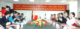 院領(lǐng)導(dǎo)劉立成、蔡敬民、鄭永紅、陳嘯、丁明等首先在主教學(xué)樓2樓會議室親切會見金夏中一行。會見中,副院長蔡敬民教授向金夏中介紹了我院的辦學(xué)情況特別是我院的中韓合作辦學(xué)情況,指出趙誠惠老師為我院對韓合作辦學(xué)作出的積極貢獻(xiàn)。金大使的到來必將推動我院與韓國高校辦學(xué)的進(jìn)一步發(fā)展,也必將對提升我院在中韓合作院校的重要地位產(chǎn)生巨大影響。金夏中大使在會談時(shí)說,合肥學(xué)院是安徽省對外發(fā)展的一個(gè)重要窗口,我很榮幸來貴校訪問并做演講。此次訪問安徽的目的是進(jìn)一步了解安徽,探討雙方合作與發(fā)展的前景與措施。其次是看望老朋友趙誠惠夫婦,感謝她們?yōu)轫n中友誼所做出貢獻(xiàn)。簡短的會談結(jié)束后,金夏中大使為我院題詞:“高瞻遠(yuǎn)矚,大展宏圖”。