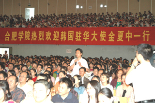接著,金夏中大使來到禮堂,為我院近1500名師生作“攜手共創(chuàng)中韓關(guān)系美好未來”演講。金夏中大使在演講前幽默詼諧地解讀自己的名字說:“夏即華夏的夏,中即中國的中,說明我與中國很有緣分?!?002年,金夏中大使曾經(jīng)訪問過安徽,通過這次訪問,他覺得安徽的變化很大。他說,非常珍惜這次訪問機(jī)會,安徽出了很多名人,韓國與安徽的交流處于起步階段,想多走走看看,多了解安徽,安徽為中國的改革開放作出過很多貢獻(xiàn),也反映了安徽人民的精神。他在演講中從韓國的經(jīng)濟(jì)發(fā)展,韓劇《大長今》、《我的野蠻女友》等曾在中國流行的韓國電視劇談到韓國的飲食和電子、汽車工業(yè);從中國的滾滾“韓流”和韓國的陣陣“漢風(fēng)”談到韓中文化的交互融合;從他個(gè)人學(xué)習(xí)漢語和出任駐中國大使談到他與中國的不解之緣;從韓中的發(fā)展歷史談到中國國家主席胡錦濤訪問韓國時(shí)與韓國總統(tǒng)盧武鉉達(dá)成的共識“在政治上,中韓兩國應(yīng)該成為不同社會制度國家和平共處的典范?!?
