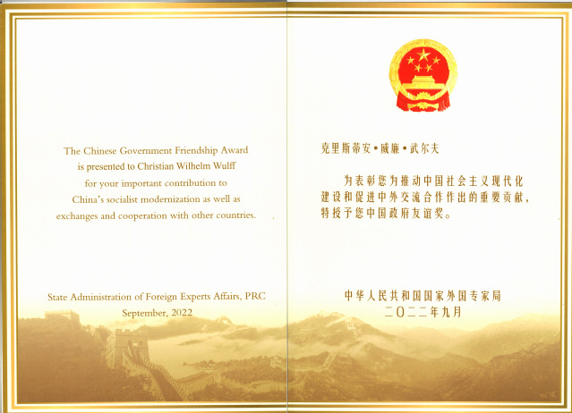 Professor Christian Wilhelm Wulff, gemeinsam empfohlen von der Universit?t Hefei und der Tongji-Universit?t, gewann den Chinese Government Friendship Award 2022 für seine herausragenden Beitr?ge zur freundschaftlichen Zusammenarbeit in den Bereichen Geisteswissenschaften, Bildung sowie Wissenschaft und Technologie zwischen China und Deutschland. Er ist der fünfte ausl?ndische Expert in der Geschichte der Universit?t Hefei, der den Chinese Government Friendship Award gewann.