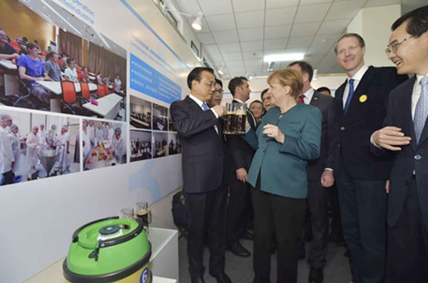 30日上午,李克強總理與德國總理默克爾在合肥學院食品專業交流合作展區共同品嘗我校學生釀制的德國黑啤。(中國新聞網人民網消息)