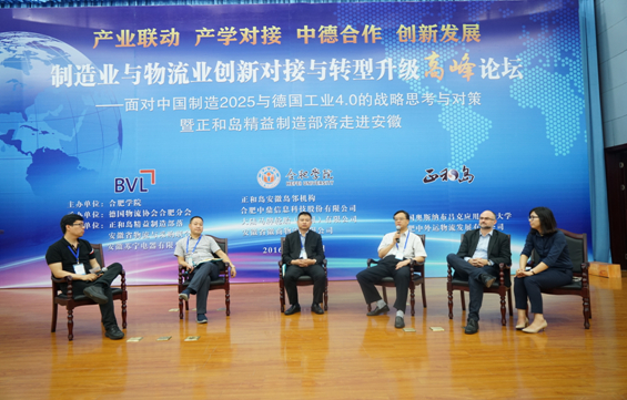 高峰論壇活動豐富緊湊,上午組織代表實地考察參觀了德國馬牌輪胎(合肥)公司、合肥中鼎信息科技股份有限公司、蘇寧電器配送中心、中外運合肥物流有限公司4家知名企業;中午參觀了“合肥學院中德合作30周年成果展”。下午的論壇會第一階段分別是中國物流采購聯合會副會長蔡進、共生物流平臺CEO盧立新、正和島副總裁王昆鵬、正和島精益制造部落酋長王洪艷等4個主題報告。隨后,論壇邀請了合肥學院黨委副書記丁明、德國馬牌輪胎公司總經理邁克爾、北京奇步自動化控制有限公司董事長李奇、陜西航天泵閥科技集團有限公司董事長林忠向等展開了“互動式對話”。 對話緊緊圍繞制造業與物流業的對接與協同創新、中國制造2025與德國工業4.0展望與對策、“互聯網+”與制造業的轉型升級、服務地方產業發展、加強產學對接等主題,開展了深入的研討交流。