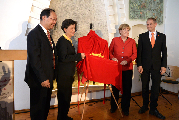 雙方致辭后,默克爾與許琳等共同為孔子學(xué)院揭牌,這是默克爾本人及德國現(xiàn)任總理首次為孔子學(xué)院揭牌。