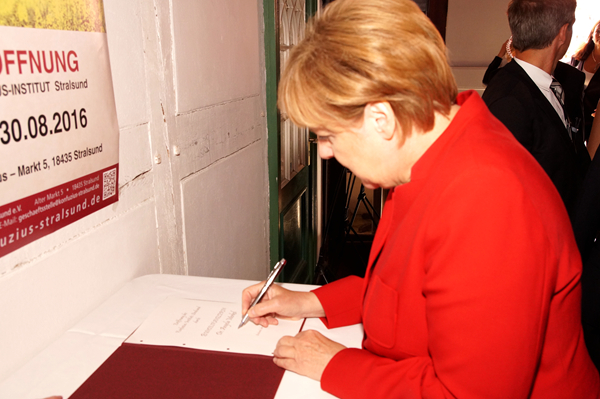 德國當?shù)貢r間8月30日下午三時許,德國總理默克爾來到施特拉爾松德市,為安徽省在西歐的第一所孔子學(xué)院——由我校共建的施特拉爾松德孔子學(xué)院揭牌。
