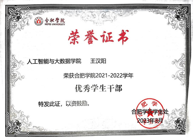 王漢陽,合肥大學人工智能與大數據學院2021級數據科學與大數據技術專業學生,中共黨員。曾獲國家獎學金兩次,合肥大學“盧文慶創新創業”獎學金,合肥大學特等獎學金等。獲“挑戰杯·華安證券”安徽省大學生課外學術科技作品競賽二等獎等。作為合肥大學青年發展服務中心主席多次舉辦校級活動與賽事,志愿服務時長超200小時。