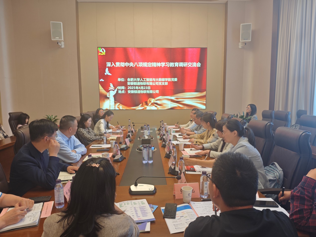 2025年4月23日,人工智能與大數據學院黨委赴安徽銀通物聯有限公司開展調研交流。此次活動是學院黨委深入貫徹中央八項規定精神學習教育,全面落實習近平總書記關于“強化校企科研合作,讓更多科技成果盡快轉化為現實生產力”重要指示精神的具體實踐,也是校企雙方圍繞深化產教融合、服務地方經濟和區域發展開展合作的重要舉措。學院黨委帶領相關科研團隊教師、支部書記等參加調研。安徽銀通物聯有限公司董事長陳世久等參加活動。