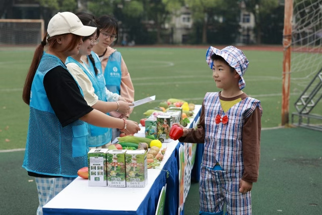 親子互動的“蔬果奧運會” 熱鬧非凡,南瓜保齡球、玉米接力賽等項目,讓家長與孩子攜手在歡樂中競技,獲勝者可兌換環(huán)保小禮物,既增進了親子關(guān)系,又激發(fā)了大家參與環(huán)保的熱情。“舊物大變身” 區(qū)域,學(xué)生黨員帶領(lǐng)大家將舊衣服改造成帆布袋、編織地墊,讓廢舊物品煥發(fā)新生,生動詮釋了循環(huán)利用的環(huán)保理念。