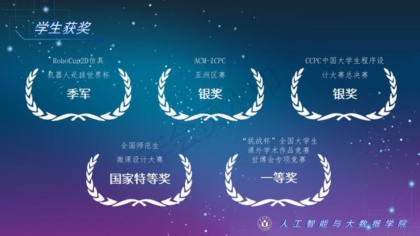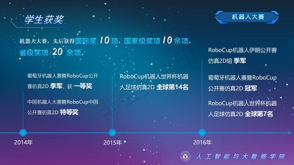 人工智能與大數據學院緊緊圍繞學校人才培養中心工作,2012年以來積極開展以學生科技創新創業為主的第二課堂工作,以學生“能力水平、專業類別和興趣愛好”為根本出發點,目前成立了: RoboCup機器人足球、數學建模、AR/VR團隊、物聯網創新設計、移動應用開發、ACM-ICPC算法設計、仿人機器人、水下機器人、區塊鏈、網絡與信息安全等16支團隊,并且專門建設了機器視覺應用、數學建模與仿真等6個學生創新實驗室、移動APP開發、多智能體系統、數據分析與仿真等8個大學生創客中心;為各團隊提供良好的環境和資源。通過這些工作的開展,人工智能與大數據學院大學生的創新創業能力逐步增強,目前有200余人常駐創新創業實驗室。近五年在師生共同努力下,在各類競賽中共獲獎800項,其中國際級21項,國家級獎項160余項、省級獎項600余項。RoboCup機器人2D仿真足球隊連續5次進入世界杯前8強,先后獲得葡萄牙公開賽冠軍、世界杯季軍等國際獎項,是世界杯、中國機器人足球賽公認強隊;此外獲得中國機器人大賽暨RoboCup公開賽曾獲得國家特等獎1項、美國大學生數學建模競賽獲得國際二等獎6項,全國大學生數學建模競賽獲得國家二等獎1項,CCPC中國大學生程序設計競賽總決賽銀牌,Robocup機器人世界杯中國賽獲得亞軍,“哈工大杯”第十六屆全國機器人錦標賽暨“博思威龍杯”第五屆國際仿人機器人奧林匹克大賽獲得國家一等獎2項,“藍橋杯”全國軟件和信息技術專業人才大賽個人賽曾獲得國家一等獎2項,“田家炳杯”第六屆全國師范院校師范生教學技能競賽國家二等獎、第二屆全國師范生微課設計大賽國家特等獎等。獲批大學生創新創業訓練計劃項目國家級86項,省級168項,獲批大學生創客實驗室項目8項,2名優秀學生獲得安徽省“創新之星”榮譽稱號。