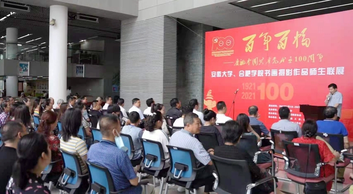 7月2日下午,為慶祝中國共產黨成立100周年,以“百年百幅”為題,由合肥學院、安徽大學共同舉辦的師生書畫攝影作品聯展在安徽大學磬苑校區文典閣開展。安徽大學黨委書記蔡敬民出席活動并致辭,我校黨委委員、宣傳統戰部部長賈峰,工會主席崔國慶參加開幕式并參觀展覽。