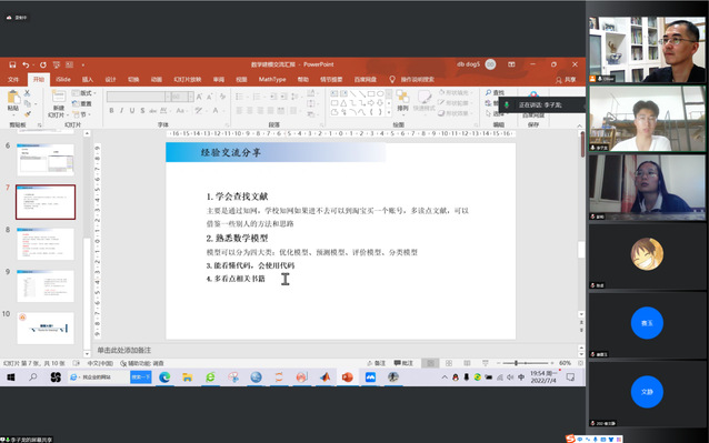 74日晚上七點半,“萌芽班”數(shù)學(xué)建模經(jīng)驗交流會之“師兄師姐說建模”在騰訊會議上如期舉行。參加本次會議的有李子龍、彭莉兩位嘉賓以及萌芽班全體同學(xué)。