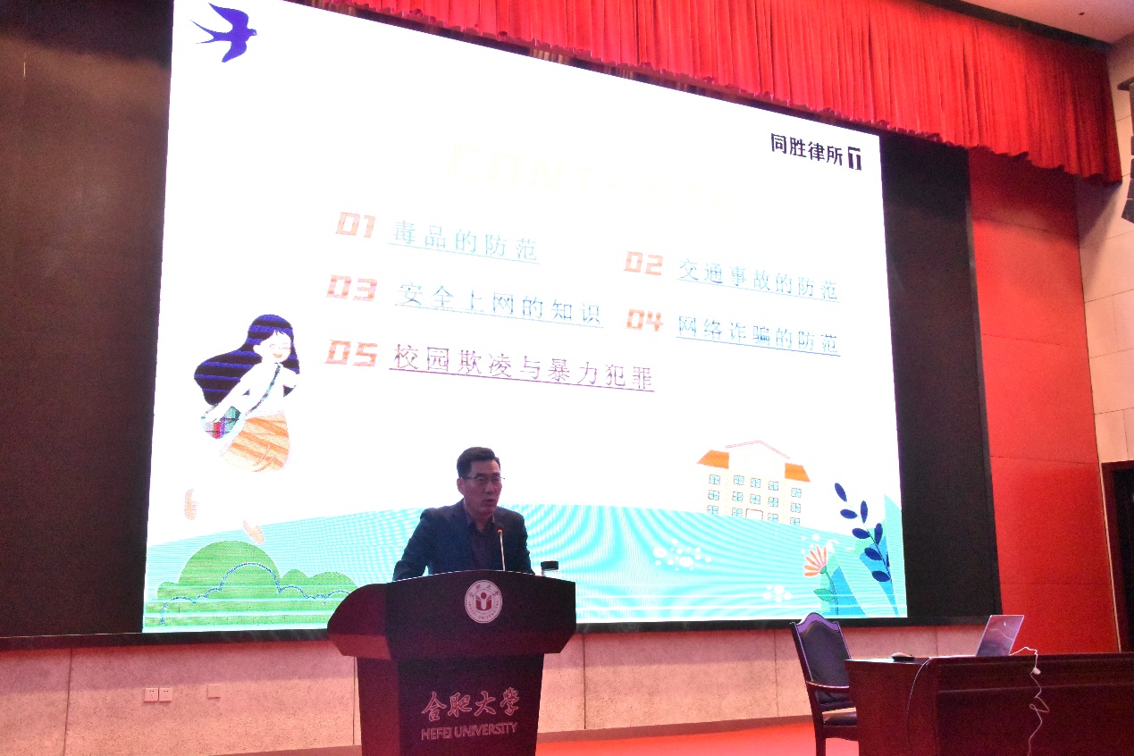 為增強高校大學生安全意識,普及法律知識,2024 10 17 日中午,合肥大學先進制造工程學院在圖書館 A 報告廳舉辦大學生安全教育主題講座,同勝律師事務所律師陳西良擔任主講人,學院2024級新生聆聽講座。