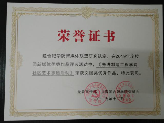 2.文化類獲獎如下:合肥學院第二屆校園廉潔文化書畫攝影作品展二等獎1項,三等獎10項;合肥學院第六屆“訊飛杯”詩文朗誦比賽校內選拔賽三等獎2項;合肥學院2019年大學生心理情景劇大賽優秀組織獎,作品《青春的轉彎》獲一等獎,作品《撥開云霧見光明》獲二等獎,作品《改變》獲三等獎;合肥學院“我和我的祖國”作品征集活動,我院作品《家國夢是每個青年人的夢》獲文字類優秀獎,《國慶節特輯/最可愛的他》、《祖國母親,生日快樂》獲新媒體類優秀獎。先進制造工程學院作品《先進制造工程院社區藝術志愿活動》在合肥學院2019年度校園新媒體優秀作品評選活動中榮獲文圖類優秀作品。(主辦方:合肥學院新媒體聯盟)