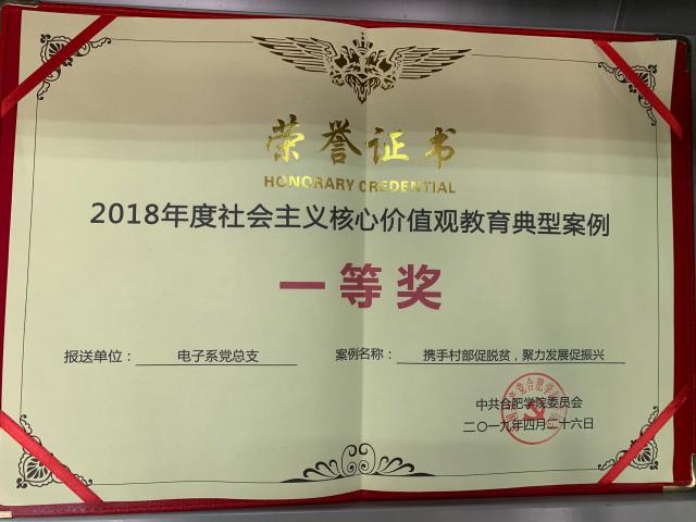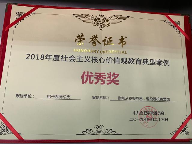 合肥學(xué)院2018年度社會(huì)主義核心價(jià)值觀教育典型案例評(píng)選中獲得一等獎(jiǎng)1項(xiàng)(攜手村部促脫貧,聚力發(fā)展促振興),優(yōu)秀獎(jiǎng)1項(xiàng)(攜筆從戎報(bào)黨恩,退役返校宣愛(ài)國(guó))