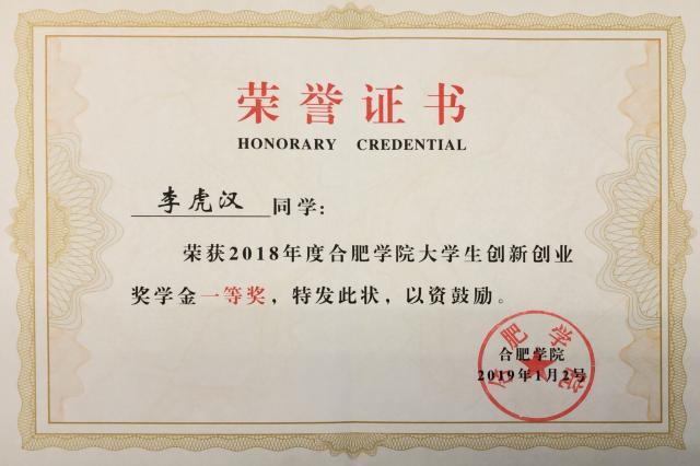 李虎漢獲2018年校創(chuàng)新創(chuàng)業(yè)一等獎(jiǎng)學(xué)金