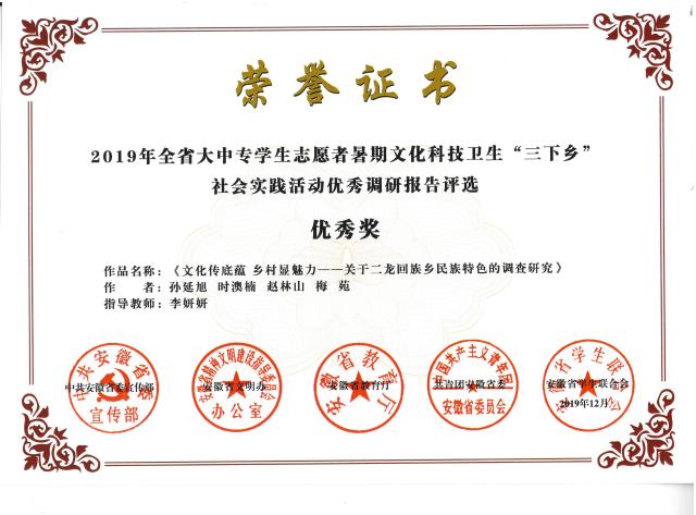 31、11月,在2019年全省大中專學(xué)生志愿者暑期“三下鄉(xiāng)”社會(huì)實(shí)踐活動(dòng)中獲優(yōu)秀調(diào)研報(bào)告優(yōu)秀獎(jiǎng)(文化傳底蘊(yùn) 鄉(xiāng)村顯魅力——關(guān)于二龍回族鄉(xiāng)民族特色的調(diào)查研究)。(主辦方:團(tuán)省委學(xué)校部、省學(xué)聯(lián)秘書(shū)處)