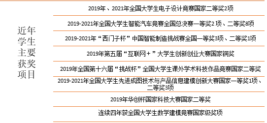 (一)專業能力本學院現有在校本科生2012人。本學院學生參加學科競賽和科技創新成績突出,2021年學院學生參與學科和技能競賽23項獲省級以上各類獎項約118項,其中國家級獎28項(其中一等獎4項、二等獎9項、三等獎13項,優秀獎2項次)、省級獎項共90項(其中一等獎21項、二等獎33項、三等獎32項、優秀獎4項)。