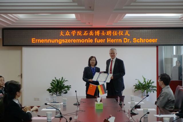 Am Morgen vom 8. Oktober hielt die Hefei-Universit?t die Ernennungszeremonie für Sonderprofessoren ab und stellte Dr. Klaus Schr?er, ehemaligen Vorstand und Ingenieur des Volkswagen Konzerns, als Sonderprofessor im Volkswagen-Institut auf Vollzeitbasis ein. An der Zeremonie nahmen Pr?sidentin Wu Chunmei, Direktor der Abteilung für Organisation Bai Yixiang, Direktor der Abteilung für Studentenangelegenheiten und Dekan des Volkswagen-Instituts Wang Xiaofeng, Direktor der Personalabteilung Ji Ping, Direktor der Abteilung für internationalen Austausch und Zusammenarbeit Zhang Hui, Parteisekret?r des Volkswagen-Instituts Xuan Yuewen, Dekan des Instituts für fortgeschrittene Fertigungstechnik Hu Xueyou und die zust?ndigen Lehrkr?fte teil. Dr. Harry Schneider, Chief Manufacturing Officer von Volkswagen Anhui, Zhu Jiangping, Director of Efficiency Management von Volkswagen Anhui, und Hendrik Dippe, Director of Maintenance Department von Volkswagen Anhui, waren zur Teilnahme an der Zeremonie eingeladen. Die Zeremonie wurde von Vizepr?sidentin Chen Xiu geleitet.