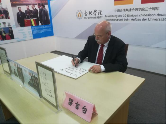 The two parties visit HFU’s Sino-German CooperationAchievement Exhibition. Chair Cai states that HFU is a local undergraduate university born in the Reform, growing in the Opening-up and developing in innovation, which has proposed its school-running orientation of “l(fā)ocality, application and internationalization” ever since 2003. Learning from the German universities of applied sciences, HFU not only promotes its own development, but also plays a leading role in the transformation and development among domestic local universities.