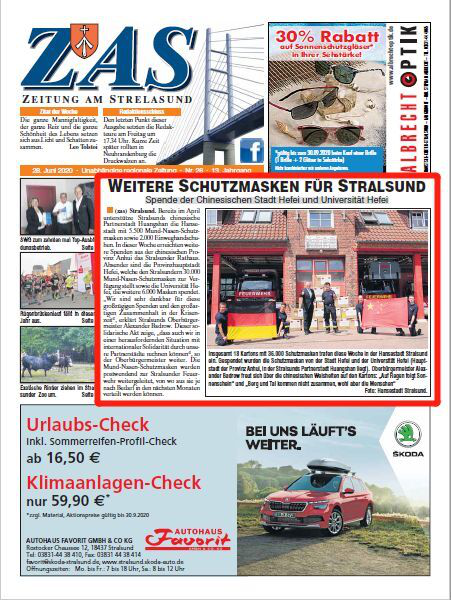 When the materials were delivered to Stralsund, on June 28th a news report entitled “Weitere Schutzmasken Für Stralsund--Spende der Chinesischen Stadt Hefei und Universit?t Hefei” hit the headlines of the local newspaper “Zeitung am Strelasund”, expressing the gratitude from its local residents for HFUs donation.