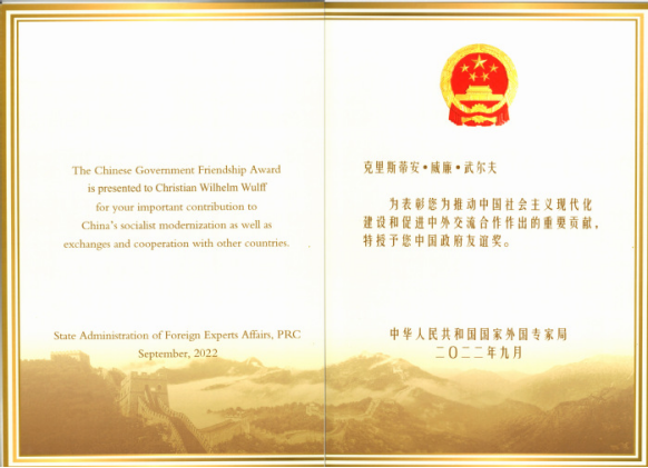 Jointly recommended by HFU and Tongji University, former Governor of Lower Saxony and President of Germany, Christian William Wulff won the 2022 Chinese Government Friendship Award for his contributions to the cooperation between China and Germany in the fields of humanities, education, science and technology. Professor Wulff is the fifth HFU foreign expert winning the Award.