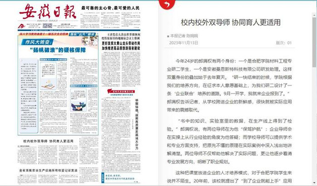 Anhui Daily featured an article titled “Dual Mentors Inside and Outside the University for Collaborative Education” on November 13, 2023, highlighting Hefei University’s (HFU) efforts to cultivate talent that meets the needs of enterprises.