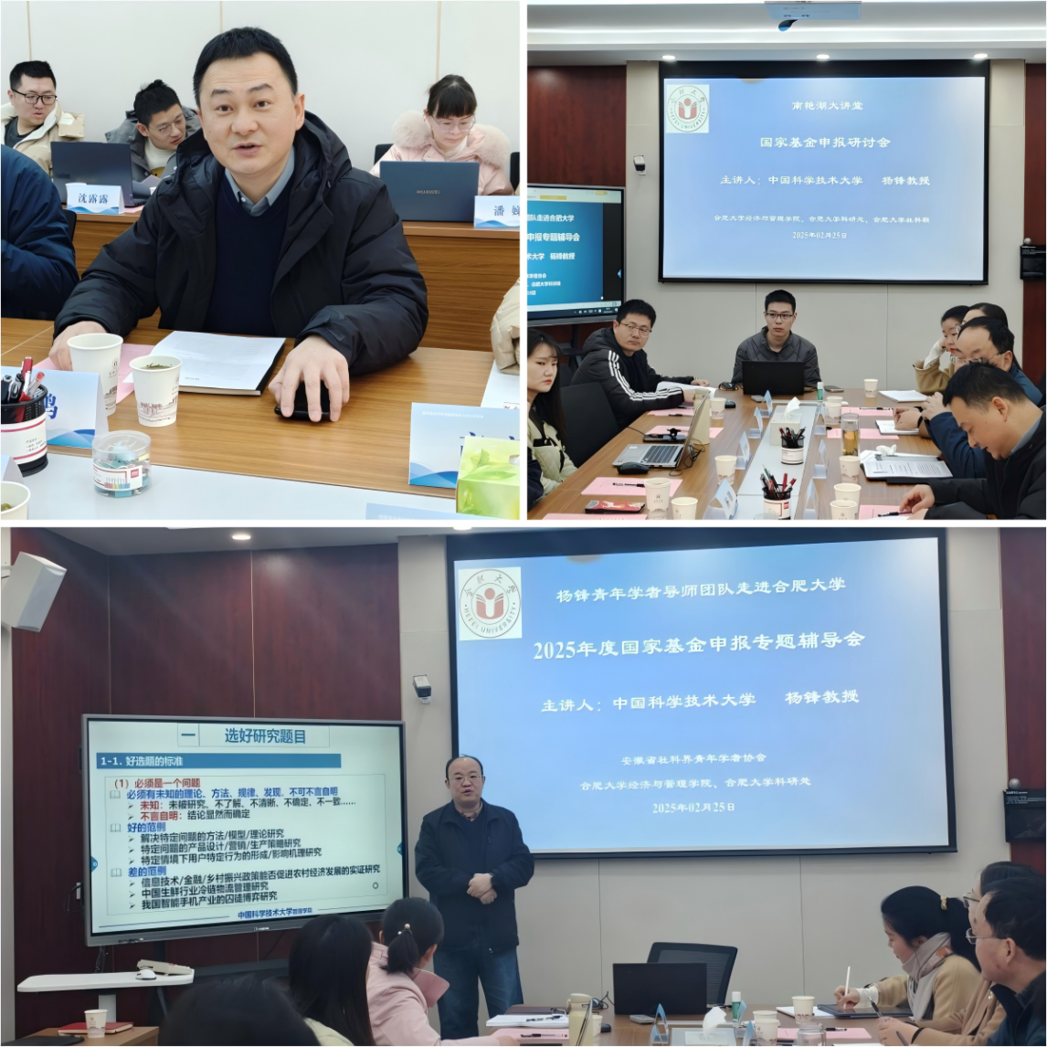 2月25日上午,由安徽省社科界青年學者協會主辦,合肥大學科研處、合肥大學經管學院承辦的2025年度國家基金申報專題輔導會南艷湖大講堂學術報告于一期四棟二樓會議室順利舉行。青年學者導師團隊中國科學技術大學管理學院博士生導師楊鋒教授應邀作學術報告。安徽省社科界青年學者協會執行會長、安徽財經大學科研處處長方鳴致詞,經管學院院長陳江華出席并主持會議,學校科研處及校內外三十多位教師參會。
