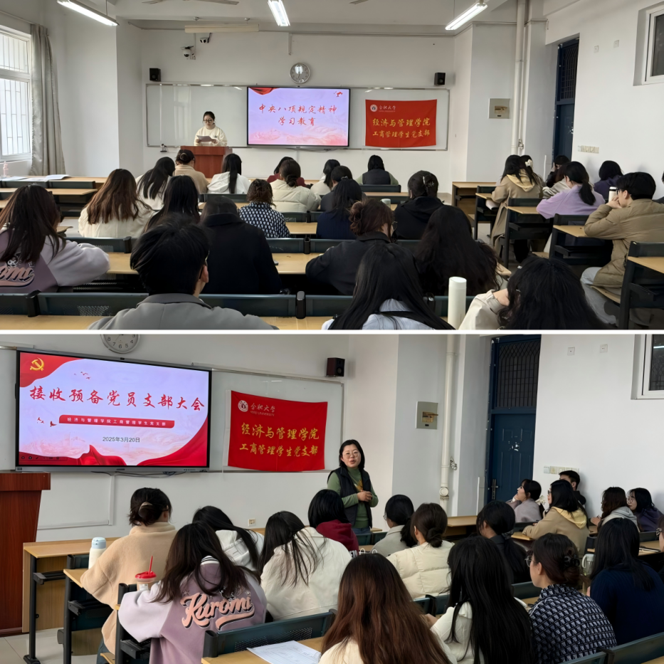 3月20日,經濟與管理學院工商管理學生黨支部在4棟102教室召開支部大會,迎接黃戈、沈樂兩名同志加入支部大家庭。