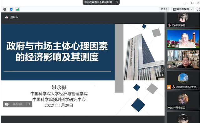 11月29日下午,由科研處與經(jīng)濟(jì)與管理學(xué)院(以下簡(jiǎn)稱(chēng)經(jīng)管學(xué)院)主辦的南艷湖大講堂學(xué)術(shù)報(bào)告在線(xiàn)上舉行,中國(guó)科學(xué)院大學(xué)經(jīng)濟(jì)與管理學(xué)院特聘教授、院長(zhǎng)洪永淼應(yīng)邀作題為“政府與市場(chǎng)主體心理因素的經(jīng)濟(jì)影響及其測(cè)度”的學(xué)術(shù)報(bào)告。報(bào)告會(huì)由經(jīng)管學(xué)院陳江華院長(zhǎng)主持,經(jīng)管學(xué)院青年教師、研究生及部分本科生共150余人參會(huì)。