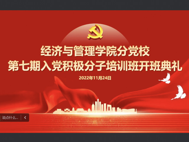 為積極開展學院黨員發展工作,培養愛黨愛國的社會主義接班人,2022年11月24日中午,經濟與管理學院分黨校第七期入黨積極分子培訓班開班典禮暨第一課在線上成功舉辦。經濟與管理學院黨委書記倪澤強、黨委副書記夏丹青、各學生黨支部書記及經濟與管理學院第七期入黨積極分子培訓班267位學員參加。