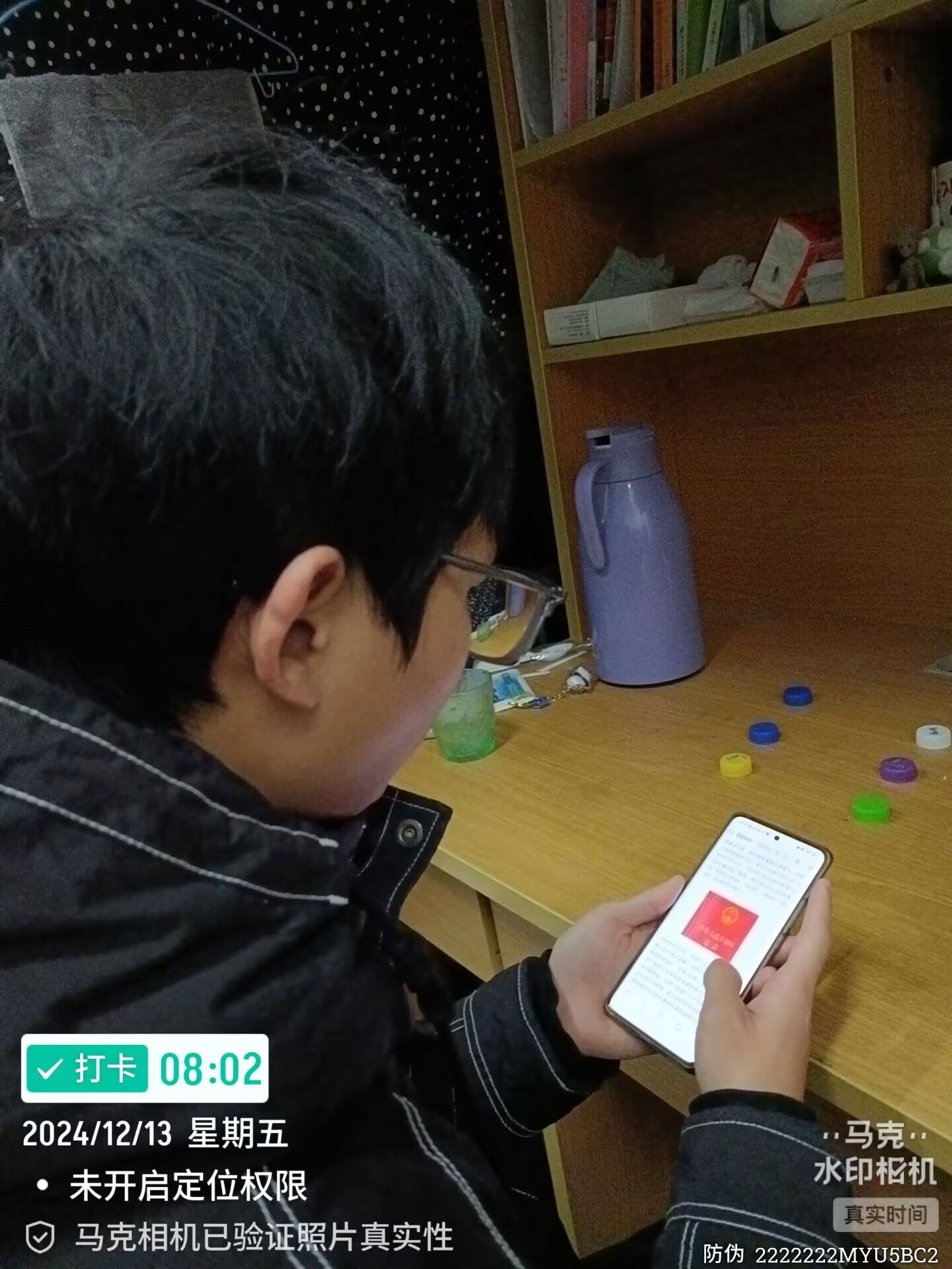本次憲法晨讀活動采用了線上打卡的形式,要求同學(xué)們在早上九點(diǎn)前認(rèn)真進(jìn)行憲法學(xué)習(xí),并拍攝帶有特定水印的人像照片,上傳至材化學(xué)院志愿團(tuán)服務(wù)隊設(shè)立的專屬群組中。每個學(xué)子在晨讀前都精心整理好自己的儀容儀表,拿起手機(jī)或相機(jī),找到合適的角度和光線,拍攝下自己精神飽滿、意氣風(fēng)發(fā)的模樣。照片上,那清晰的人像和醒目的水印,仿佛在向世界宣告著他們對憲法的尊重和對法治的信仰。