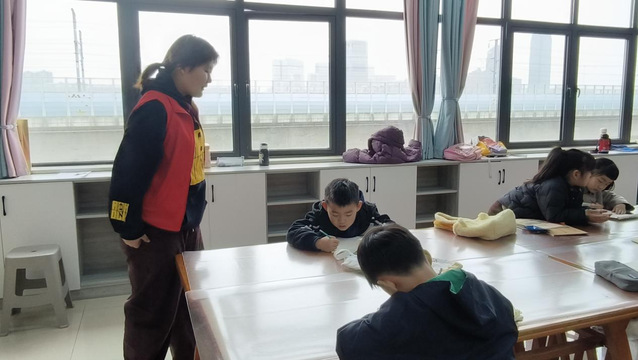上午,志愿者們在社區教室為孩子們簽到,確保每位孩子按時參與活動。書法課堂上,他們不僅協助老師維持秩序,還積極與孩子們互動,耐心指導書寫技巧,營造出濃厚的學習氛圍,讓原本略顯枯燥的書法課變得妙趣橫生,極大激發了孩子們對書法的興趣。