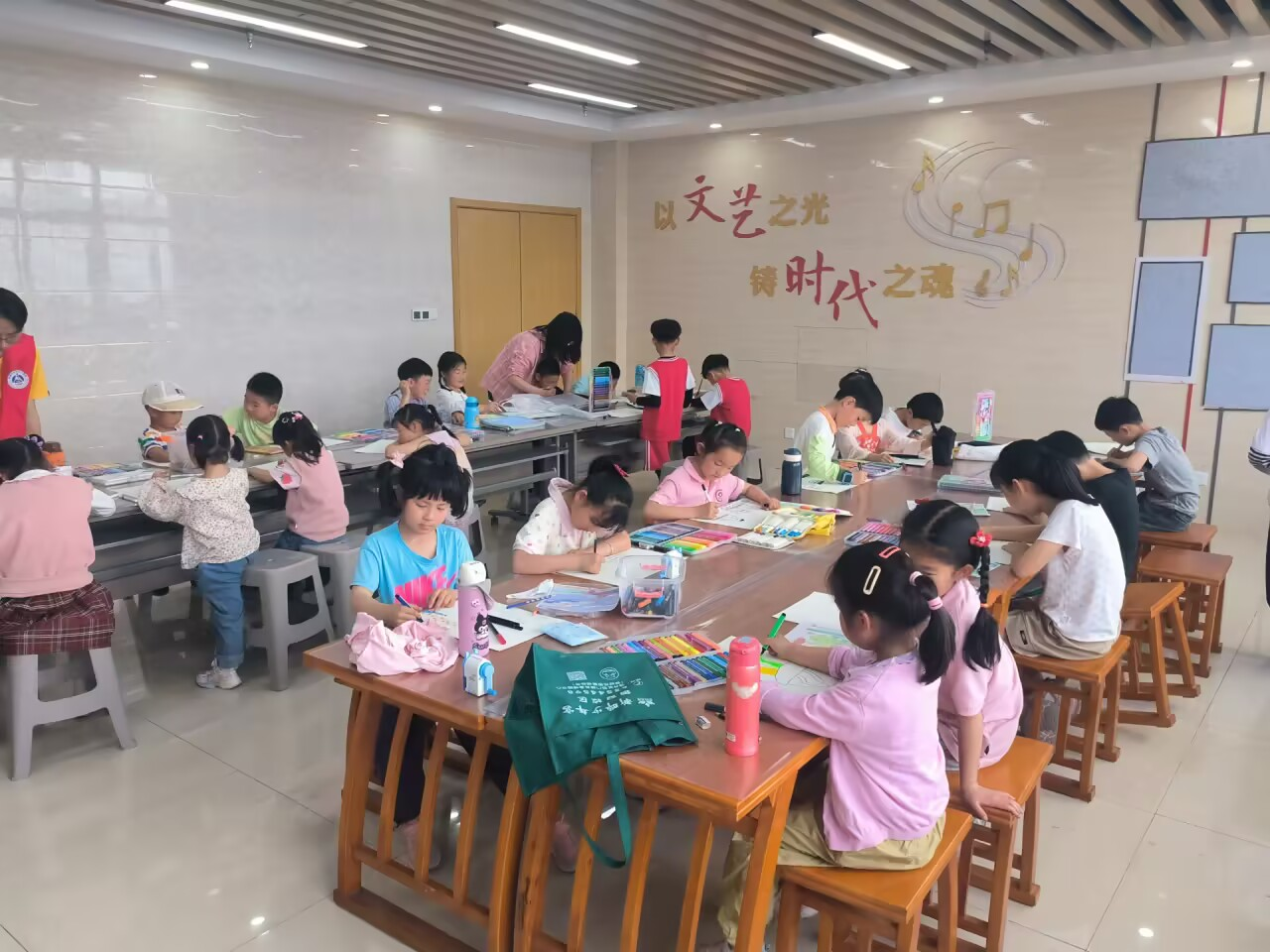 時間在悄然無聲中悄然流逝,轉瞬間,下課鈴聲響起。小朋友們卻依舊沉醉在創作的歡樂海洋里,他們的作品漸漸展現出獨一無二的個性與魅力。志愿者們目睹這一幅幅溫馨而又充滿奇思妙想的畫面,內心洋溢著滿滿的成就感與歡樂。
