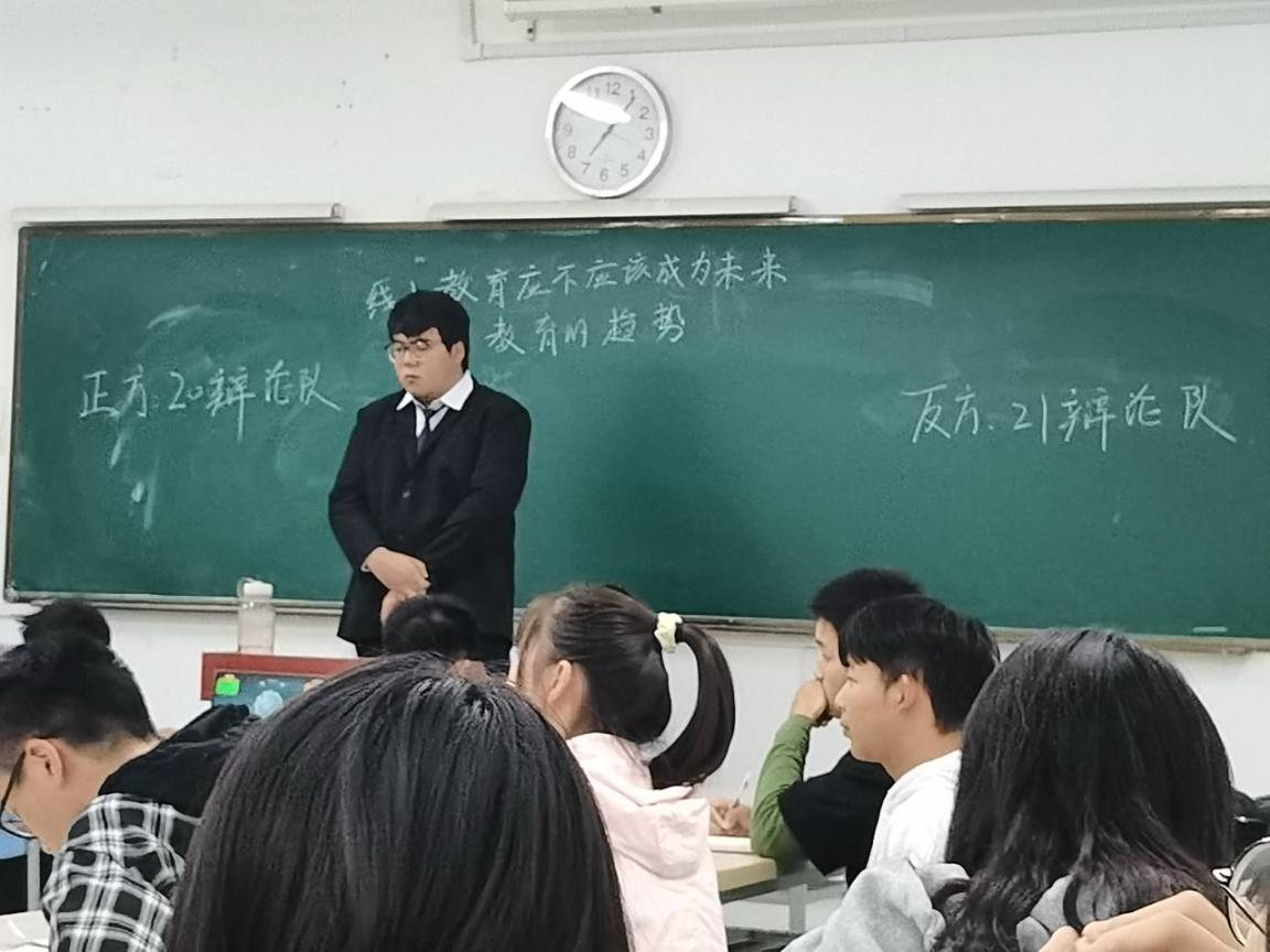 比賽伊始,現場可謂是“無聲之處勝有聲”,火藥味十足;帥氣的裁判,身著正裝,挺拔著身姿;辯手們更有著“戰士們”一往無前的氣勢。在主持人鏗鏘有力地宣講比賽事宜和雙方辯手進行簡潔的自我介紹后,比賽正式開始。兩隊就線上教育應不應該成為未來的教育趨勢的問題展開辯論。雙方選手在立論,駁立論,智辯等環節中據理力爭,引經據典,字字珠璣,使現場氣氛迅速升溫。在隨后的自由辯中20辯論隊辯手們咬緊牙關,在劣勢的情況下背水一戰。而21辯論隊對對方步步緊逼,力破對手防御,雙方唇槍舌戰。正方言語犀利,反方辯述簡明有力,雙方你來我往,互不相讓的激烈辯論給聽眾帶來了一場視聽盛宴。而經過這場充滿硝煙的角逐,最終以21辯論隊在本次比賽中勝出。