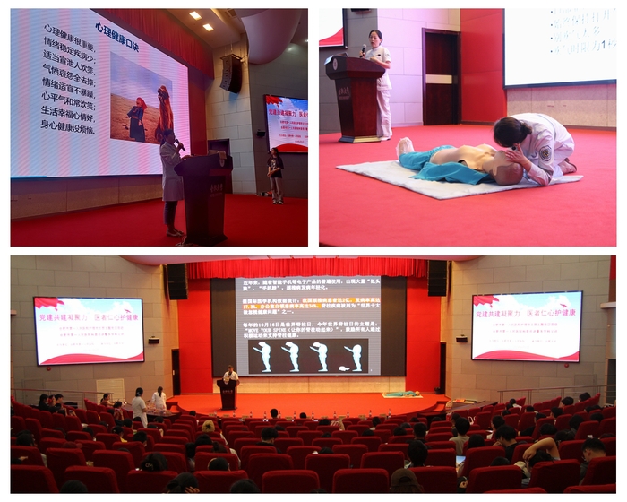 66日,學(xué)校在圖書(shū)館報(bào)告廳開(kāi)展健康科普宣講活動(dòng)。合肥市第一人民醫(yī)院濱湖院區(qū)執(zhí)行院長(zhǎng)潘愛(ài)紅帶領(lǐng)專(zhuān)家團(tuán)隊(duì)參加活動(dòng)。脊椎骨科主任杜怡斌介紹了頸椎的結(jié)構(gòu)以及頸椎病的成因、治療方法和預(yù)防措施。心理咨詢(xún)門(mén)診護(hù)士長(zhǎng)陳曉菊帶領(lǐng)學(xué)生學(xué)習(xí)手指健身操,分享調(diào)節(jié)情緒的方法。急診急救護(hù)士長(zhǎng)劉荊科普心肺復(fù)蘇急救知識(shí),現(xiàn)場(chǎng)演示模擬心肺復(fù)蘇的全過(guò)程。當(dāng)天,圖書(shū)館一樓大廳還設(shè)置了眼科、脊柱骨科、關(guān)節(jié)骨科、中醫(yī)科、心理咨詢(xún)、康復(fù)科、消化內(nèi)科等多個(gè)義診點(diǎn),為師生提供血壓、血糖、視力等多方面的檢查及咨詢(xún)服務(wù)。