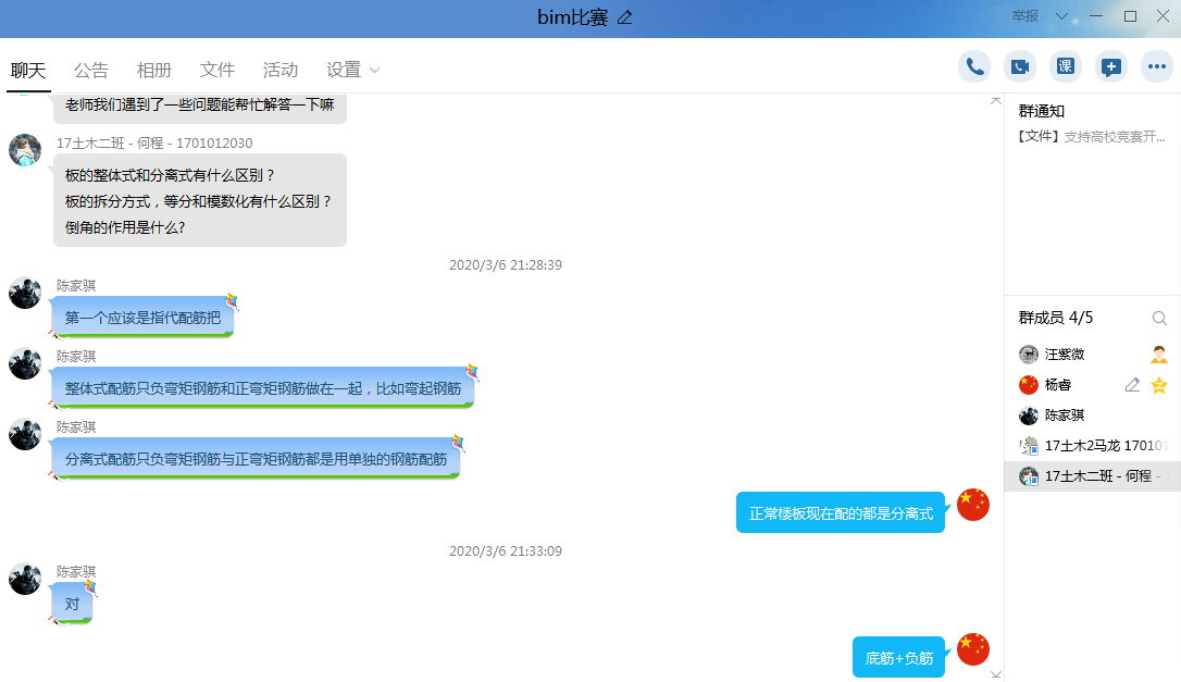 雖然是遠程網絡指導,但參訓的學生一樣有具體的集訓內容安排。訓練采用學生自主學習和老師線上指導結合的方式完成。老師搜集了比賽相關的培訓資源和規范圖集,發給學生學習,布置一周必須完成的訓練內容,并在QQ群回答學生自主學習中遇到的問題。為了達到更好的訓練效果,指導老師還通過電話會議的方式給學生分析歷年賽題,講解重難點,檢查學生的訓練情況,點評學生的訓練效果;在老師指導的同時,讓學生積極發言,講述學習和訓練過程中的感受,分析薄弱環節,隨時調整訓練計劃,期待在下一階段訓練中提升水平。在指導的間隙,老師還積極引導學生們要保持積極樂觀的情緒,不要對疫情恐慌,在做好疫情防范的基礎上,將注意力轉移到BIM大賽的遠程集訓上積極備賽,對戰勝疫情和在BIM競賽中取得好成績要充滿信心,力爭在本屆比賽中獲得歷史最好成績,取得突破。