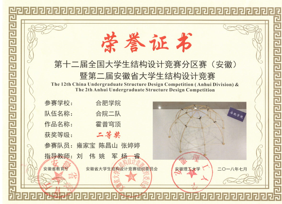近三年,我校土木工程專業(yè)學生在第十屆(第十一屆、第十二屆)“高教杯”全國大學生先進成圖與信息建模大賽中獲得3個專項一等獎,2個專項二等獎,6個專項三等獎;第十屆(第十一屆、第十二屆)全國周培源大學生力學競賽二等獎1項,三等獎6項;第一屆(第二屆、第三屆)安徽大學生結(jié)構(gòu)設(shè)計大賽團體2個三等獎,二等獎一項,三等獎一項;安徽省第一屆BIM大賽三等獎一項。多次組織“力與美”硬幣造型比賽、CAD大賽、周培源力學競賽選拔賽、測量技能競賽等競賽。