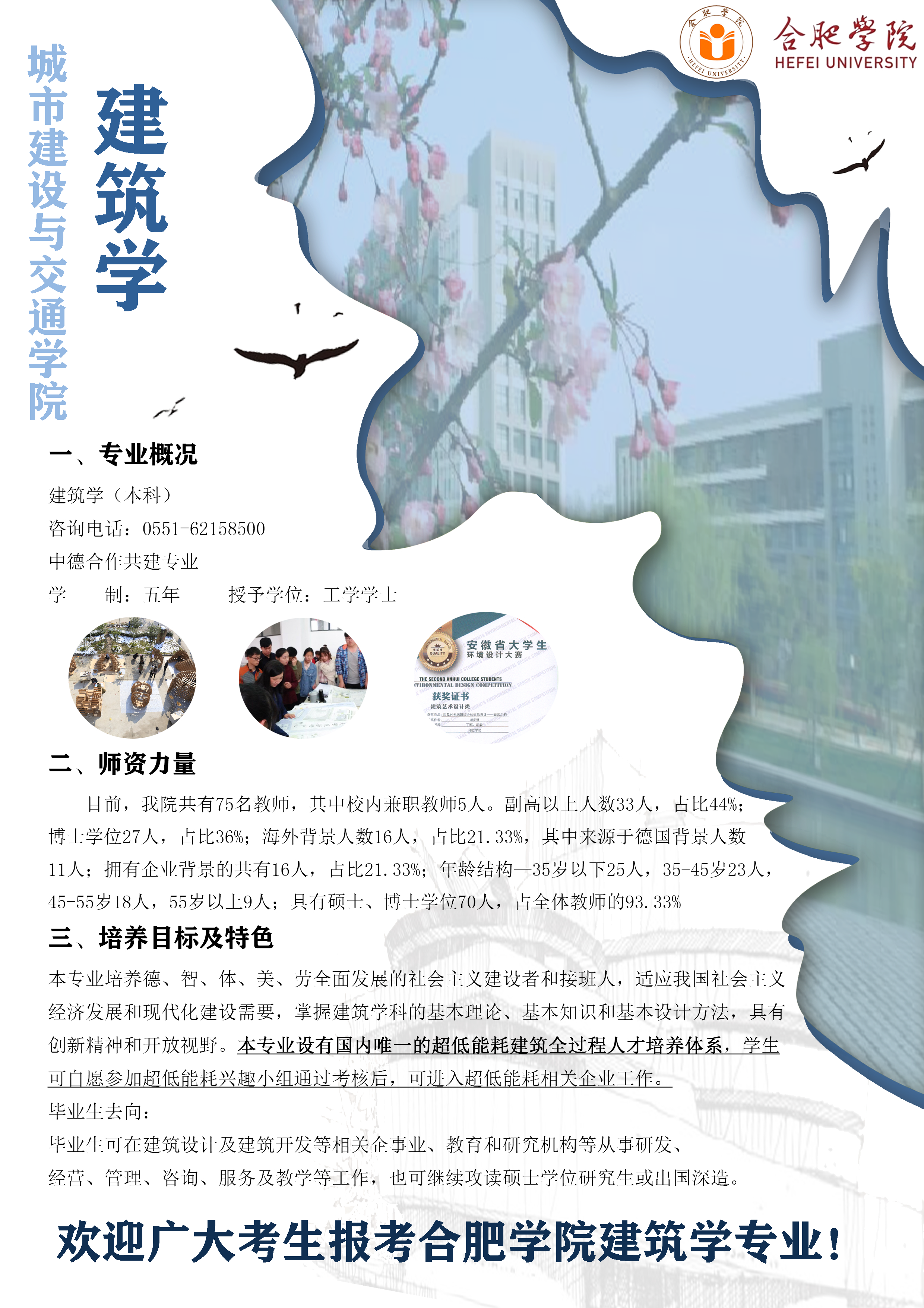本專業培養德、智、體、美、勞全面發展的社會主義建設者和接班人,適應我國社會主義經濟發展和現代化建設需要,掌握建筑學科的基本理論、基本知識和基本設計方法,接受建筑師基本訓練,具備扎實的建筑知識和較強的設計能力,具有創新精神和開放視野。培養立足合肥、面向安徽、服務全國的擁有節能環保和“碳達峰”、“碳中和”理念并能在城市建設領域從事建筑與規劃設計、科學研究和管理工作的復合型、應用型專門人才。