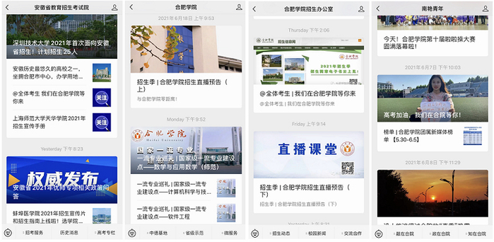 校微信公眾號影響力持續提升。招生辦與宣傳部、校團委、文傳學院共建合肥學院招生宣傳新媒體工作室,三大微信公眾號平臺通力合作,在招生宣傳季陸續發布學校宣傳視頻2部及招生政策、招生宣傳活動安排和專業簡介等系列主題推送40余篇,貫穿學校近三年辦學成果,全面直觀地介紹了學院專業的師資隊伍、學生活動和教學科研成果等內容,為關注學院專業發展和有意報考的考生提供了全方位的信息服務。