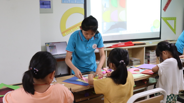 飛屋是同學(xué)們用雙手制作出來,夢想也將由他們的雙手創(chuàng)造。教學(xué)開始,高凡老師在黑板上寫下本節(jié)課主題。在同學(xué)們翹首以盼的目光下,老師開始了本堂手工制作課的步驟講解。課堂之中,孩子們趴在滿是卡紙、彩泥等制作材料的桌子前,迫不及待地創(chuàng)作專屬自己的作品。同學(xué)們用自己天馬行空的想象力,呈現(xiàn)出一個個五彩斑斕的小房子。他們從這些卡紙中,精心挑選出一張來當(dāng)作底板,后剪下雙面膠豎貼于棉簽兩端。高凡老師在講臺上一步步示范操作的步驟,同學(xué)們拿著折紙跟著教師一步步完成,同學(xué)們都聽的十分認真。在這個過程中,助教會巡視整個教室,遇到有不懂的同學(xué),助教會立即上前幫助,盡力確保每一位同學(xué)都參與進課堂、跟上教學(xué)進度。與此同時,老師鼓勵同學(xué)們用彩色卡紙,自主剪出梯形、小正方形和長方型的圖案做成小裝飾品,發(fā)揮自己的創(chuàng)意,創(chuàng)造獨屬于自己的夢想飛屋。