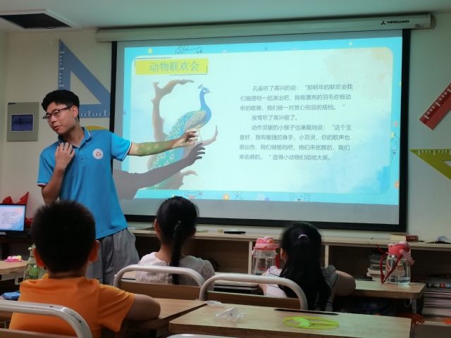 課堂伊始,田老師使用手語操引入課程,借此引發學生對手語歌的歌詞與動作的思考。當歌曲《你真的很不錯》響起,同學們就模仿老師的動作開始做起手語操。在歡快激昂的音樂聲中,大家對彼此豎起大拇指,大聲說道“你是真的、真的、真的很不錯!”歌聲將歇,同學們還久久沉浸在愉悅的氛圍中。隨后,田老師給同學們講了一個充滿童趣的故事——《動物聯歡會》,故事中,孔雀與夜鶯相互欣賞、彼此贊美。歌曲與故事互相映證,讓同學們更深入地理解“每個人都有自己的特色,人們在相處交往時就像在照鏡子,你欣賞別人,別人也就會欣賞你”這一課程主題。