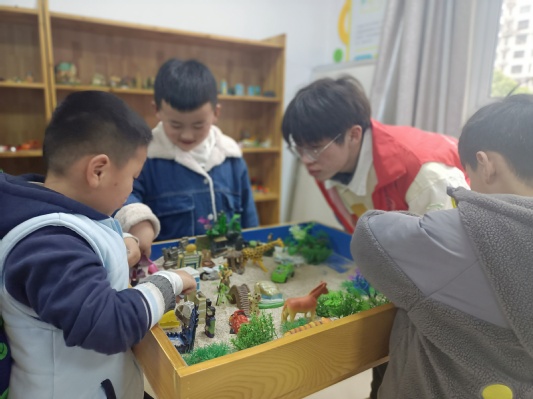 在活動過程中,心理志愿服務(wù)隊成員首先讓小朋友們選取自己喜歡的沙具并按照自己喜歡的方式擺放,其次作為觀察者和陪伴者的身份,幫助小朋友們通過創(chuàng)造沙盤世界、重建沙盤世界等過程,運用沙具發(fā)揮自主想象創(chuàng)造沙盤,使小朋友們的內(nèi)心世界和外界生活得以逐步呈現(xiàn)和自我展示。小朋友們樂在其中,紛紛進行了心與心的交流與感悟,充分體驗沙盤游戲帶來的魅力。