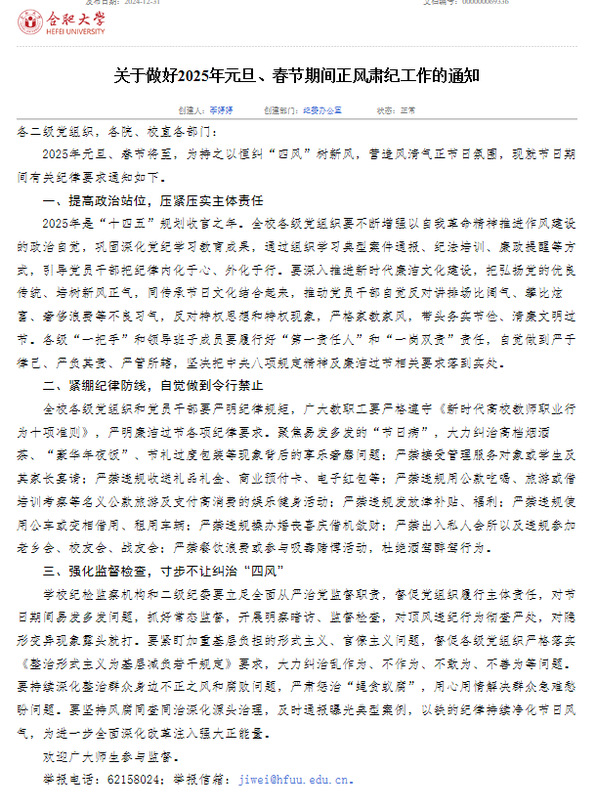 現(xiàn)將中共合肥大學(xué)紀(jì)律檢查委員會(huì)、省監(jiān)委駐合肥大學(xué)監(jiān)察專員辦公室《關(guān)于做好2025年元旦、春節(jié)期間正風(fēng)肅紀(jì)工作的通知》轉(zhuǎn)發(fā)給你們,請(qǐng)認(rèn)真學(xué)習(xí)領(lǐng)會(huì),嚴(yán)格執(zhí)行有關(guān)規(guī)定。