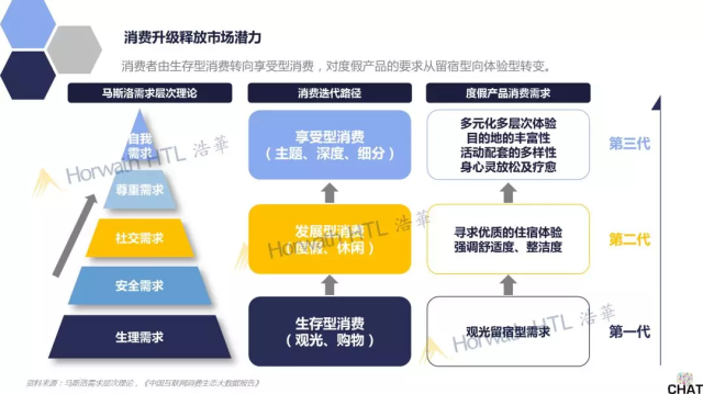 國民經濟發展的同時伴隨著國民消費的升級,尤其是度假需求的消費升級和產品迭代,從起初僅有觀光留宿需求的生存型消費,進階到第二代發展型消費,出游者開始尋求優質的住宿體驗,強調度假產品的舒適度及整潔度,發展至今到第三代享受型消費,人們除了住宿產品以外開始追尋多層次的住宿體驗,希望住宿產品可以配套多元化的設施及活動,追求身心靈的放松及體驗。消費升級也催生出多元化的消費分級維度和模式,例如可以從游客年齡、出行方式、出行游伴、出游動機、出游時間、目的地等維度進行細分。