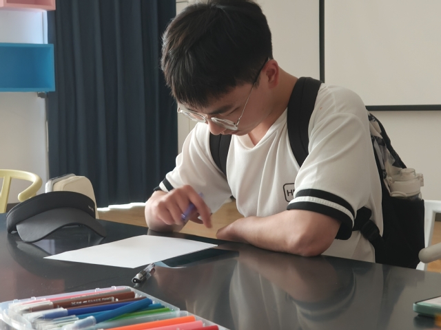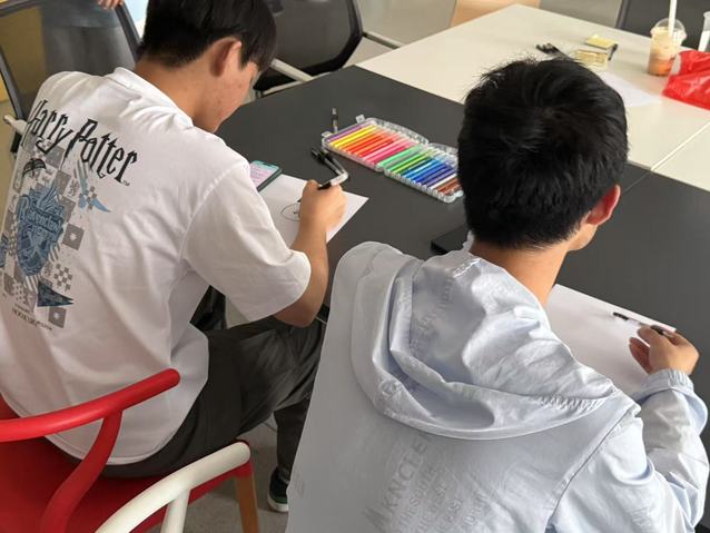 活動現(xiàn)場,參與者用A4紙和彩筆繪制代表3D全息能量場的大泡泡,將自己置于中心,在周圍小泡泡寫下個(gè)人相關(guān)信息包括不限于個(gè)人興趣、特長、目標(biāo)、缺點(diǎn)等。通過這種可視化的自我表達(dá),同學(xué)們對自身特點(diǎn)有了更清晰的認(rèn)識,更好的與心相擁,發(fā)現(xiàn)自身的閃光點(diǎn)與不足。