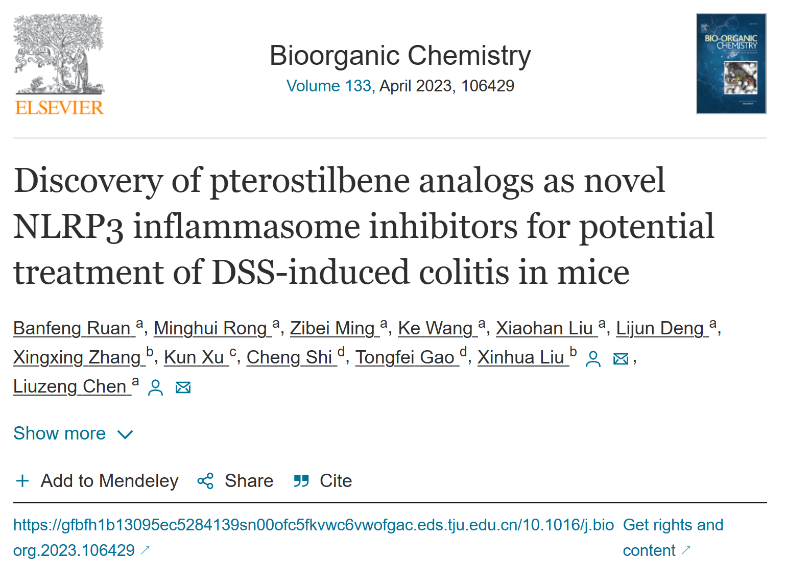 近日,我院阮班鋒研究員團隊在國際知名刊物《BioorganicChemistry》(中科院化學一區,Top期刊)上以“Discoveryof pterostilbene analogs as novel NLRP3 inflammasome inhibitors forpotential treatment of DSS-induced colitis inmice”為題發表了天然產物紫檀芪的藥用性質開發方面的最新研究成果。阮班鋒研究員為論文第一作者,合肥學院為該論文第一署名單位。