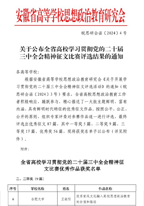20241119日,根據安徽省高等學校思想政治教育研究會《關于公布全省高校學習貫徹黨的二十屆三中全會精神征文比賽評選結果的通知》(皖思研會函〔20244 號),我院王能引老師撰寫的論文《優秀家風文化融入高校思想政治教育的價值和路徑》榮獲二等獎。